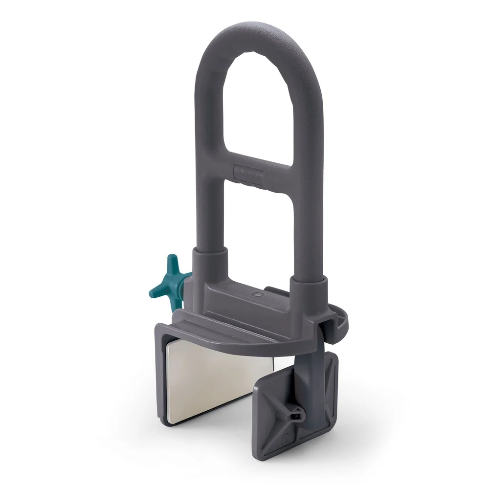 Incredibly easy to install, it clamps to all common sizes of bathtubs quickly, easily and securely with non-slip rubber pads. It's so easy to attach and detach, you can even take it with you when you travel. The tub assist bar is made with enamel-coated steel for strength, featuring curved and straight surfaces to provide more grab points at a variety of angles. To keep the bar fresh and clean, the entire product is infused with antimicrobial protection to inhibit the growth of bacteria, mold and mildew continuously. This product does not protect users or others against disease-causing bacteria. Enamel-coated steel assist bar features tool-free installation with non-slip, rubber-lined pads that clamp to tub surfaces without scratching. Bar offers 1. 25" (3. 2 cm) gripping diameter. Mounts on tub sides from 2.75" - 6.25". All parts are infused with Microban antimicrobial technology for built-in protection that inhibits the growth of stains and odors from bacteria, mold & mildew. Supports up to 250 lbs., and weighs 5. 2 lbs.